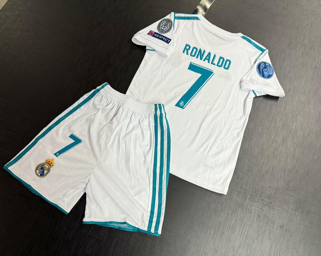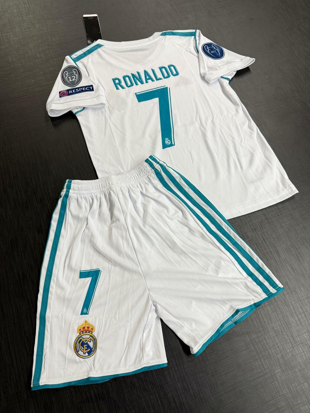 Conjunto retro de camiseta y short para niños del Real Madrid de la temporada 2017/18 con la 7 de Cristiano Ronaldo