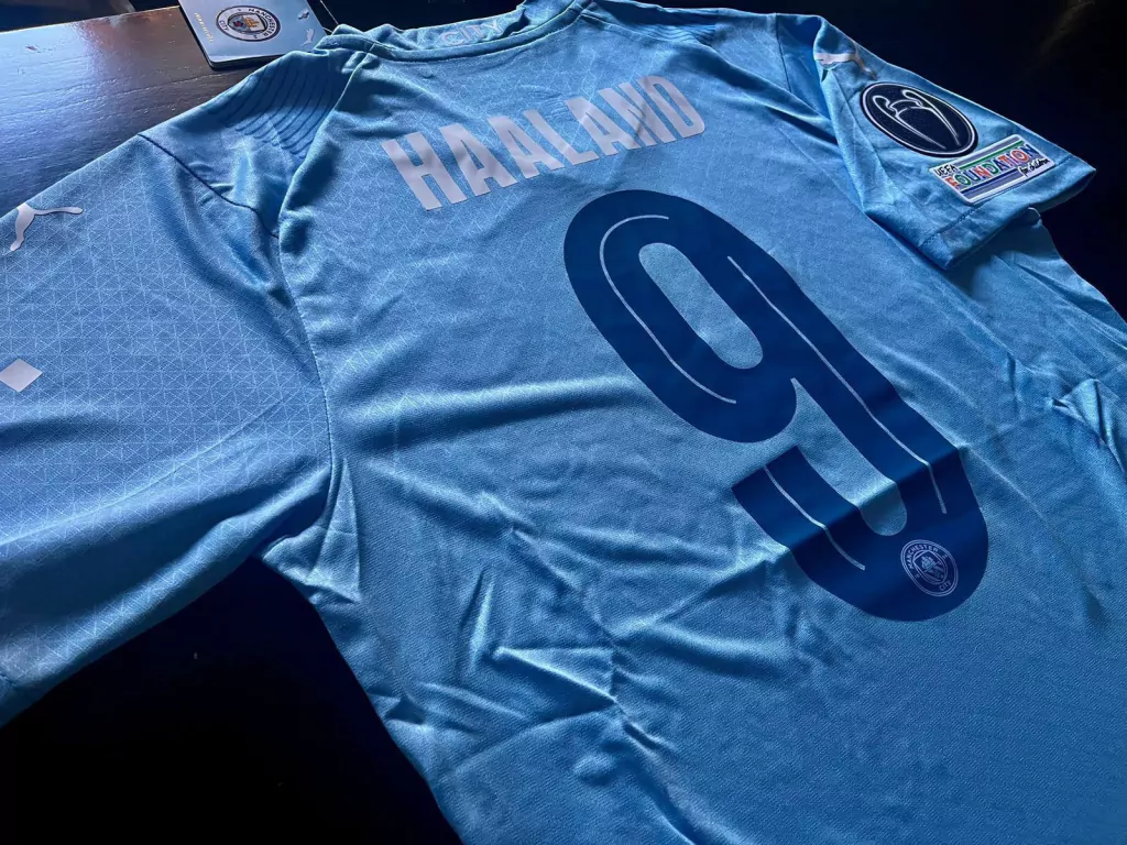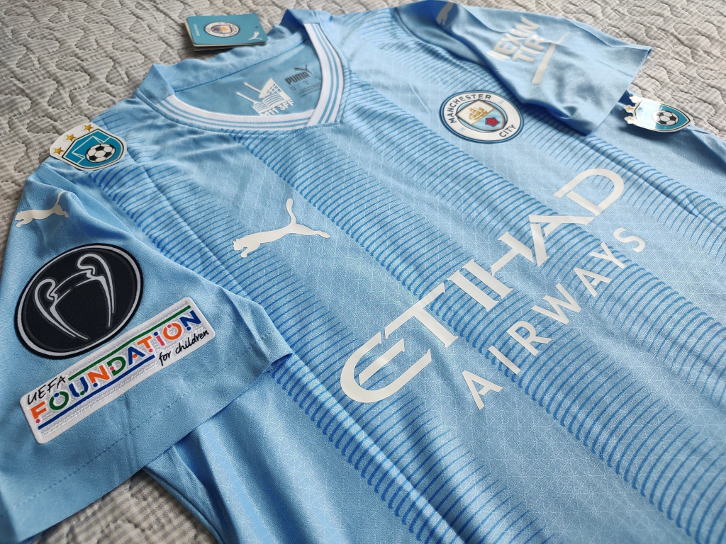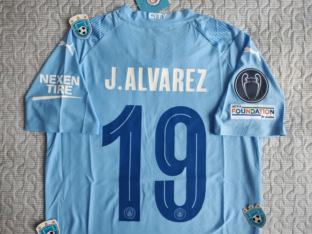 Camiseta titular del Manchester City temporada 2023/24 con Haaland 9 o J. Álvarez 19en versión jugador (Authentic) de Champions League